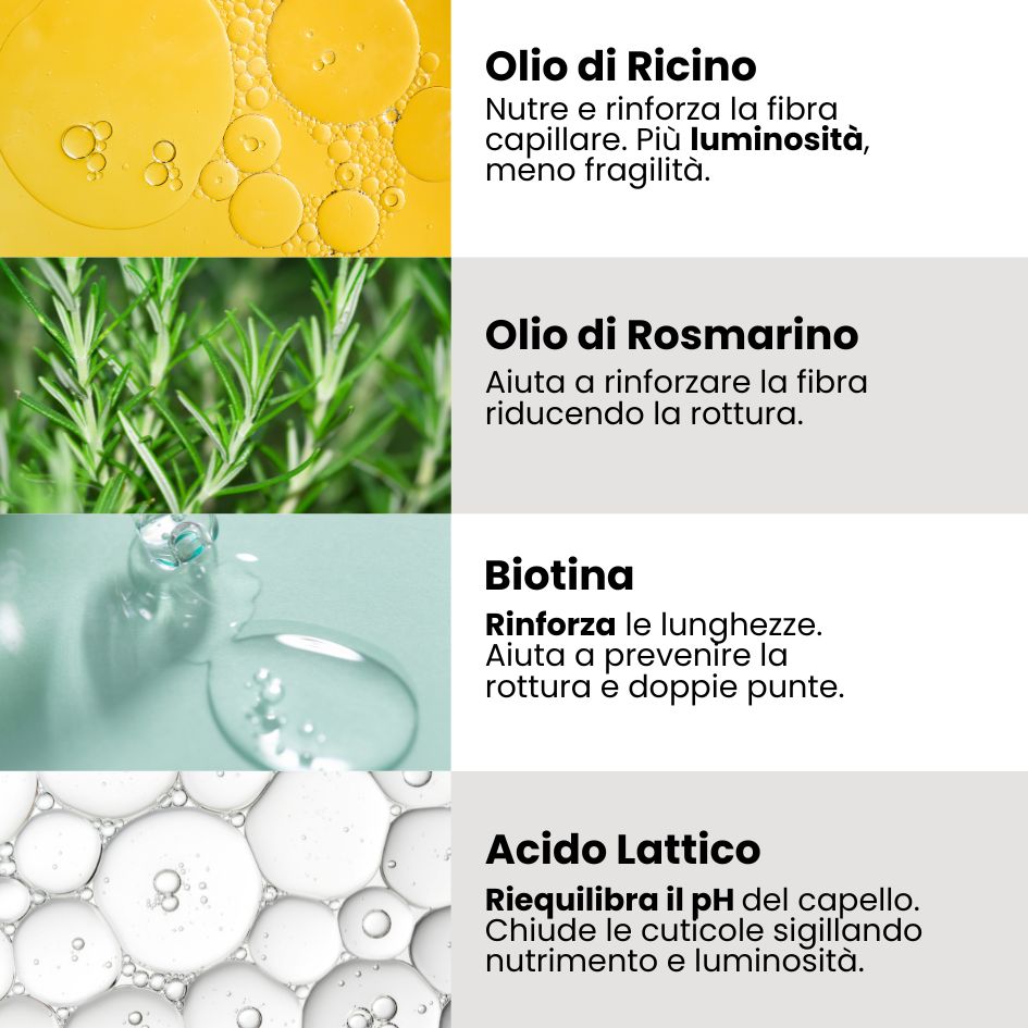 Rinforza le lunghezze: Biotina e Olio di Rosmarino rinforzano la fibra capillare, riducendo rottura e doppie punte