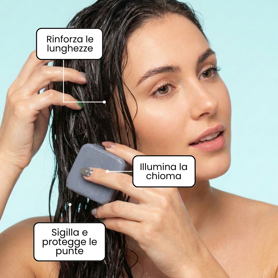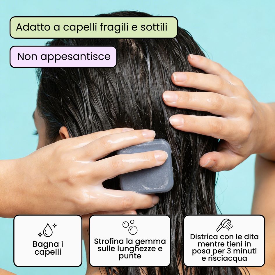 No, il balsamo si applica solo sulle lunghezze, dal centro alle punte. Evita la cute. Bagna bene i capelli, strofina la gemma tra le mani o direttamente sulle lunghezze sotto acqua calda: la texture diventa cremosa. Districa con le dita, tieni in posa 3 minuti e risciacqua.