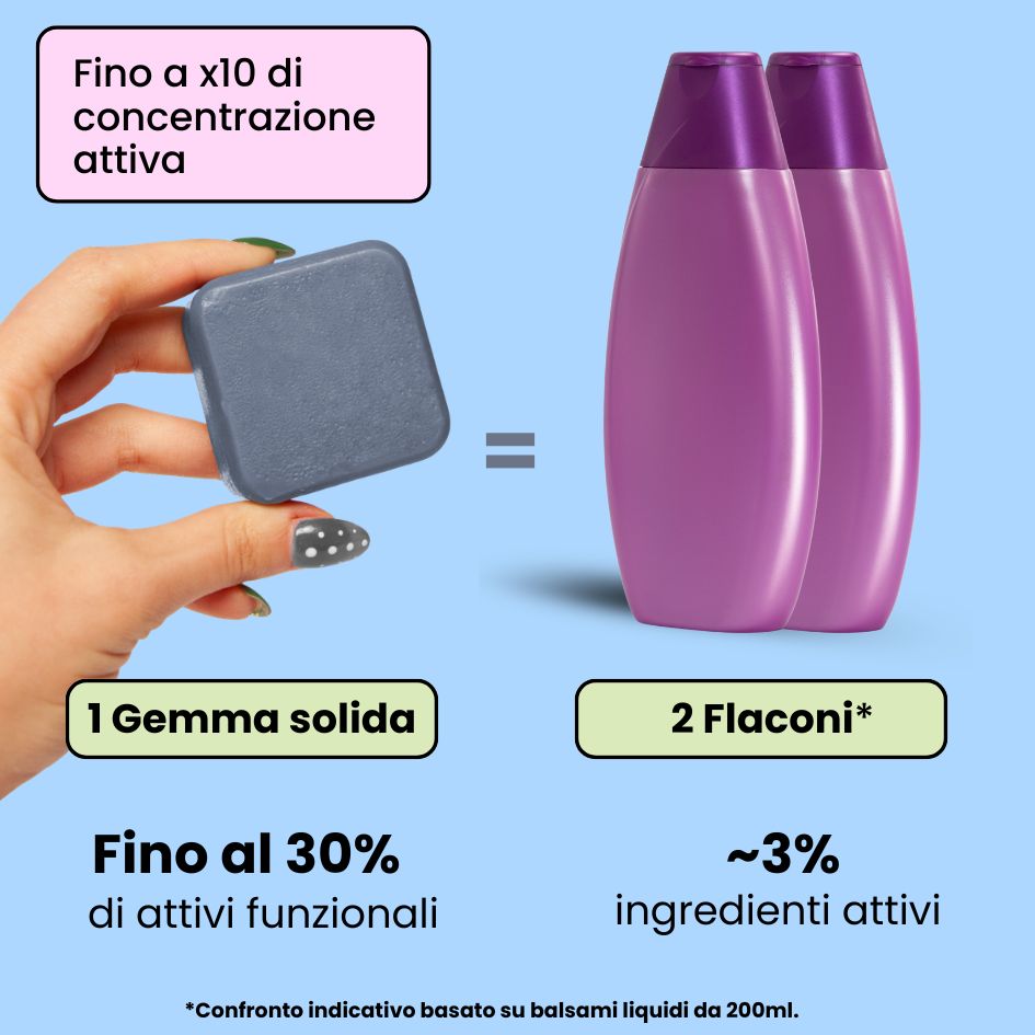 Una gemma da 65g equivale a circa 2 flaconi di balsamo liquido da 200ml. La durata effettiva dipende dalla lunghezza dei capelli e dalla frequenza d’uso: in media 40-60 applicazioni.