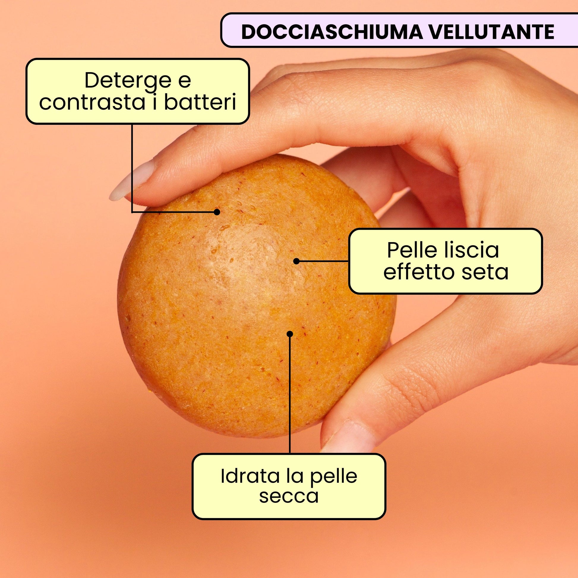 Docciaschiuma Vellutante: Ideato per coccolare la tua pelle, questo docciaschiuma solido lascia la pelle incredibilmente liscia e setosa, trasformando ogni doccia in un momento di puro piacere.