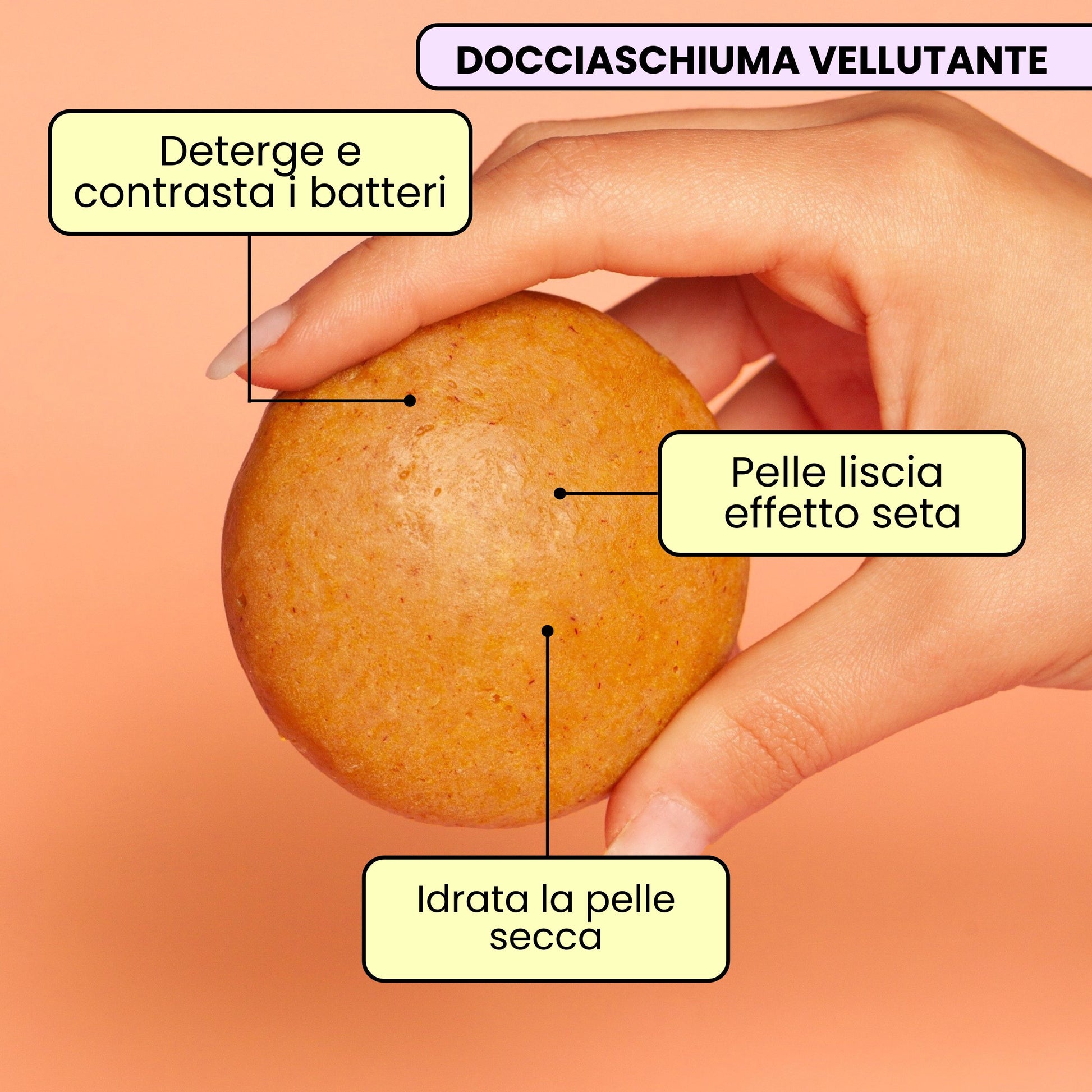 Docciaschiuma Vellutante Solido Pesca e Mango: avvolge la pelle lasciandola liscia e setosa. Il burro di mango e l'olio di noccioli di albicocca nutrono in profondità durante la detersione. Il vivace profumo di pesca, infine, trasforma ogni doccia in un momento di puro relax e benessere.