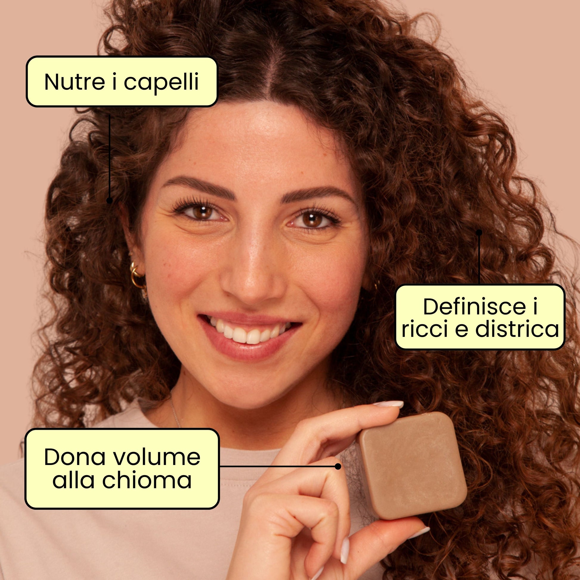 Shampoo Solido Anticrespo: riduce il crespo alla radice e deterge senza appesantire. L'olio di Argan e l'olio di Cocco nutrono le lunghezze secche, il Luppolo dona volume naturale, l'estratto di Castagna fortifica e previene la rottura.