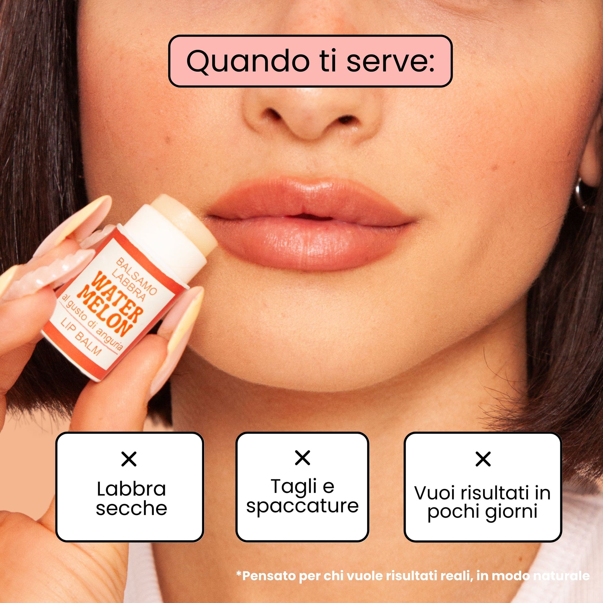 • Balsamo Labbra all'Anguria: Tutta la freschezza idratante dell'anguria per una sensazione di benessere immediato e duraturo.