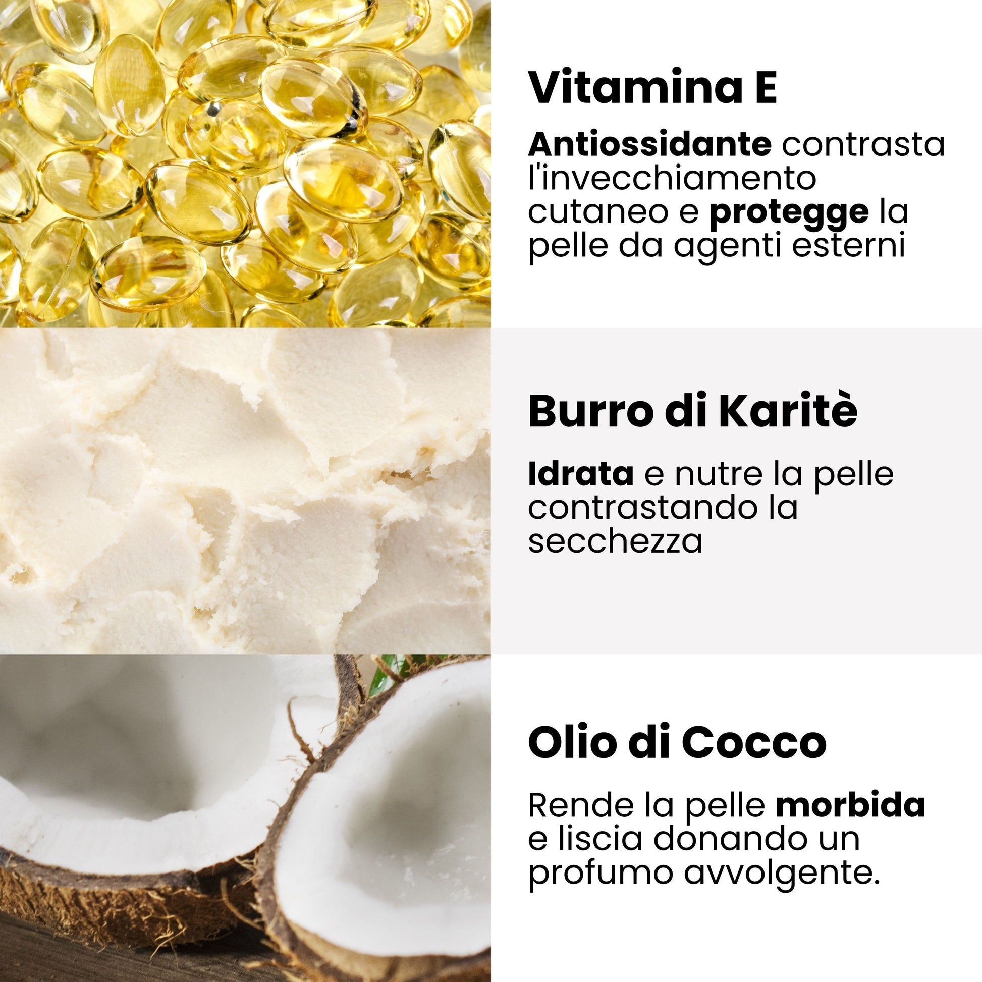 - 🥥 NUTRIENTE: La gemma Nutriente ha una formula studiata nei nostri laboratori per riequilibrare il film idrolipidico della pelle con specifici ingredienti dalla potente azione emolliente e antiage, per una pelle idratata, nutrita e protetta dall'aggressione degli agenti esterni.