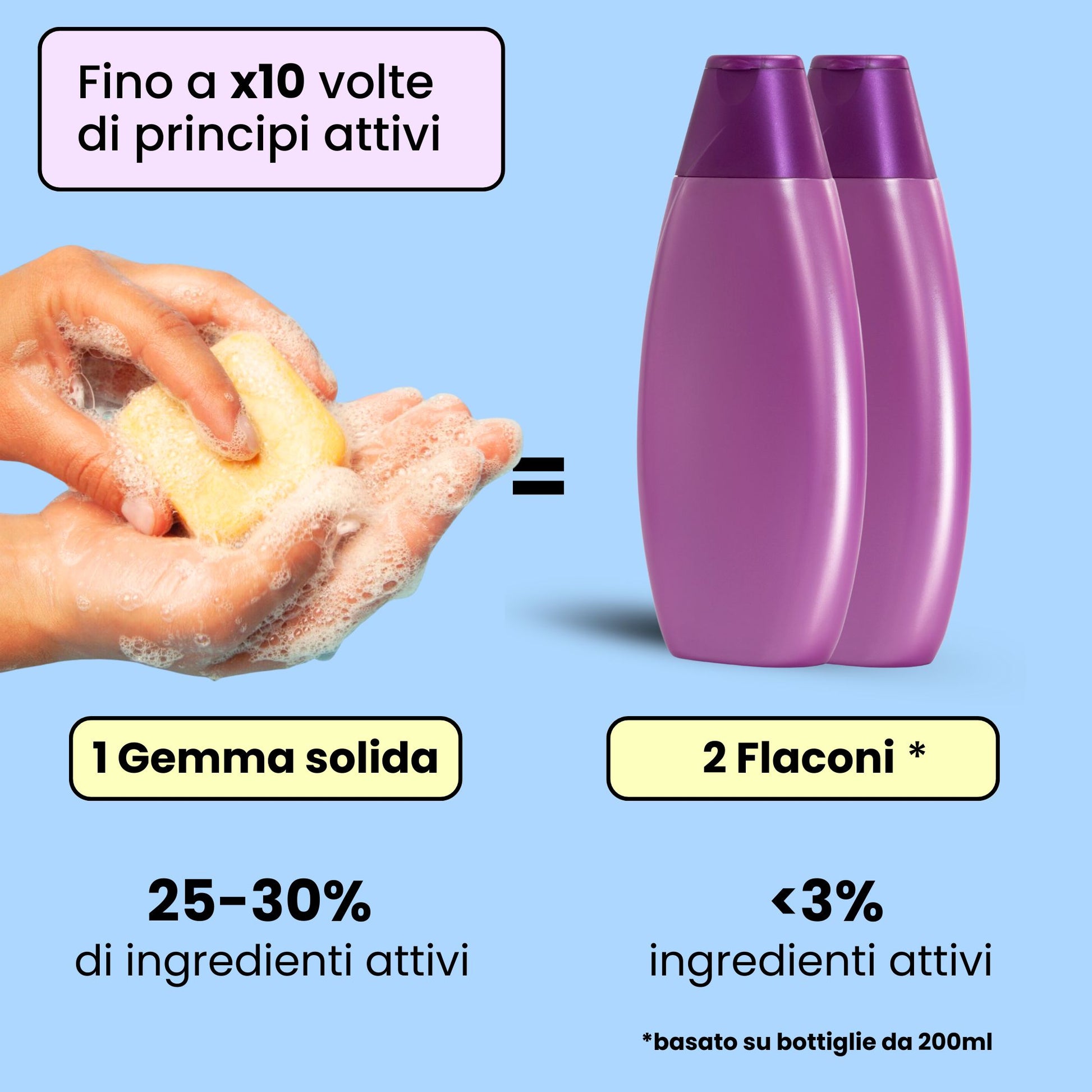 Il risparmio avviene grazie alla durata prolungata nel tempo. Un panetto di shampoo solido da 65g dura tra i 2 e i 4 mesi, anche con utilizzi frequenti. Si evita così l’acquisto ricorrente di flaconi tradizionali, riducendo il consumo di prodotti liquidi che contengono principalmente acqua e sostanze nocive per l'ambiente.